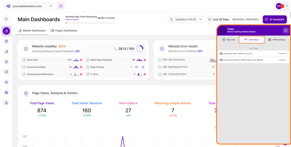 By clicking on the Chat History tab, you can easily find and retrieve all conversations you have had with TWAIA to date. This ensures you never lose a valuable insight. You can always refer back to past chats, continue where you left off, or simply review your chat history.
