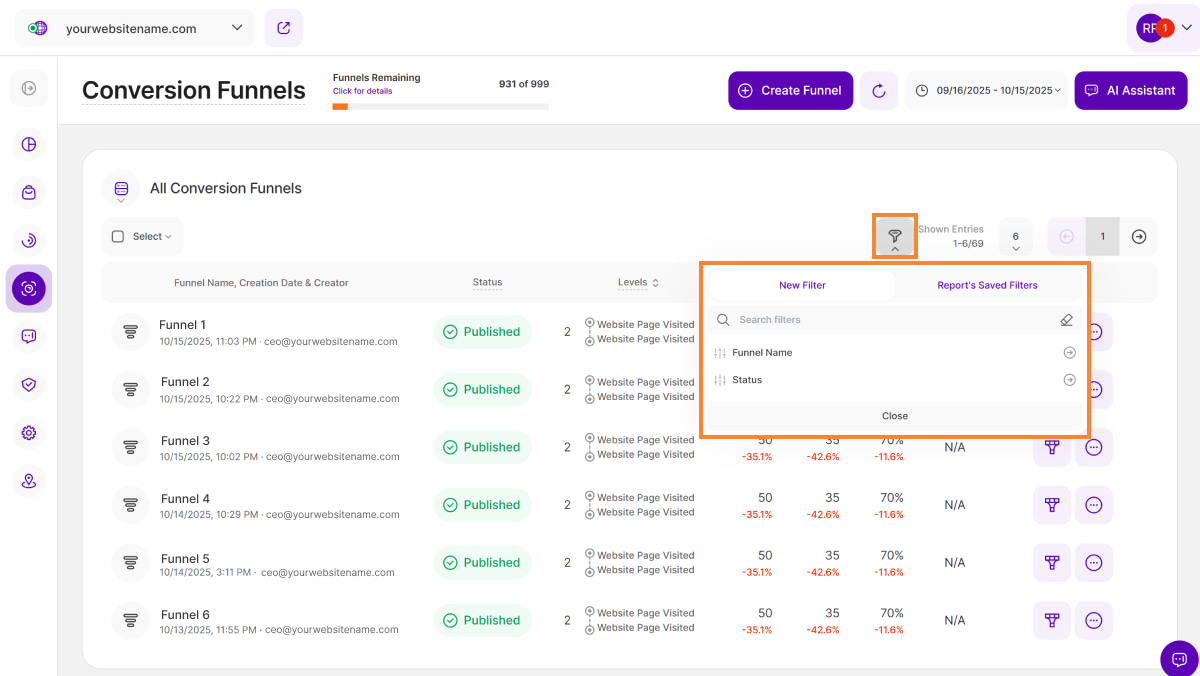 - Status: Displays the current status of each created funnel, if it's Published or Draft.