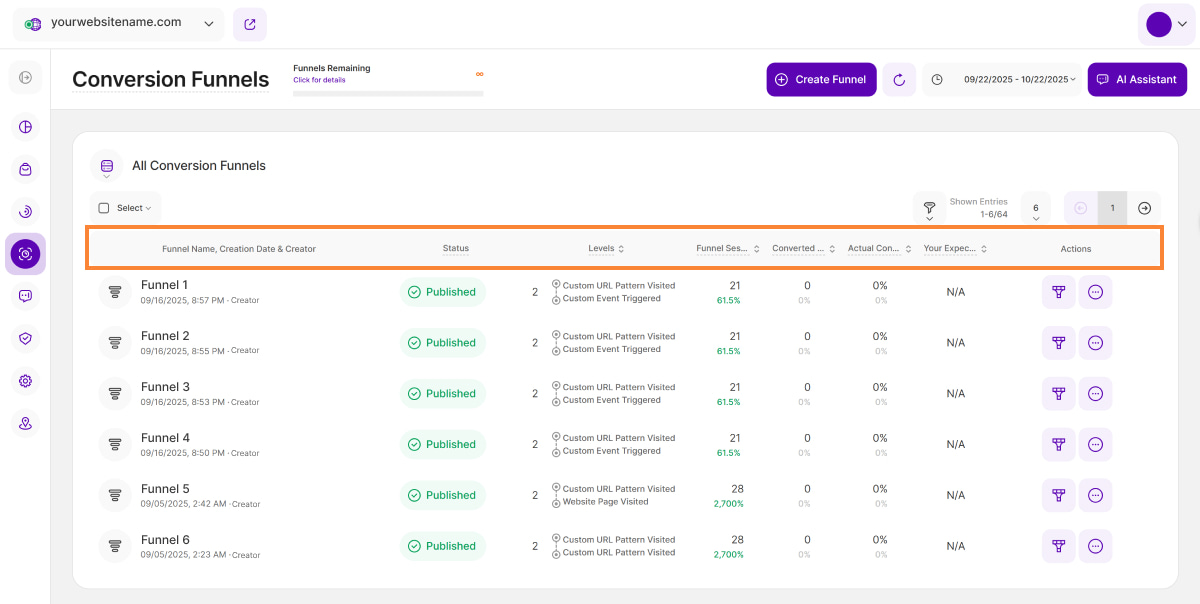 - Created On: Shows the date and time when the funnel was created.