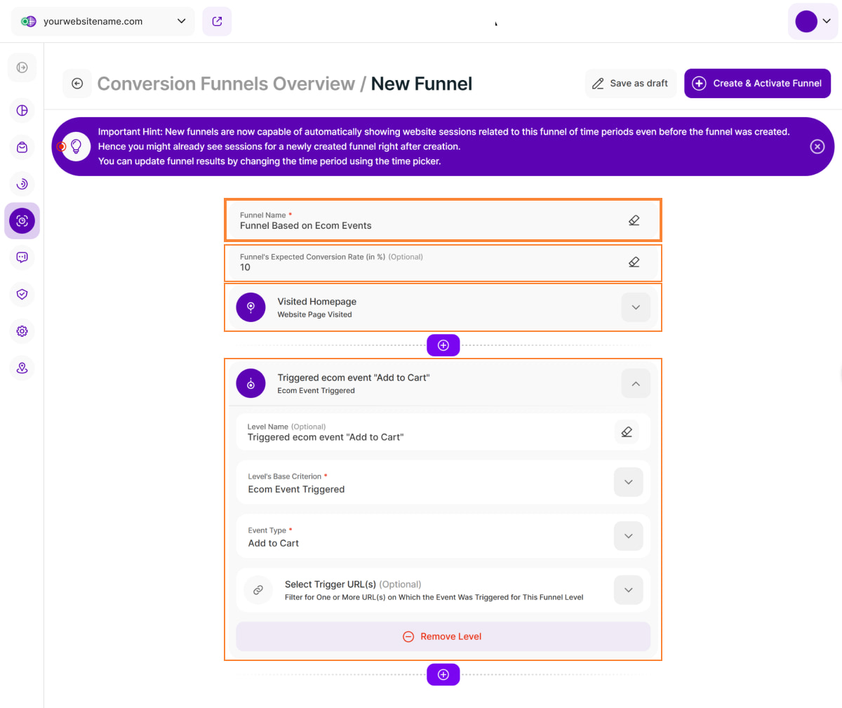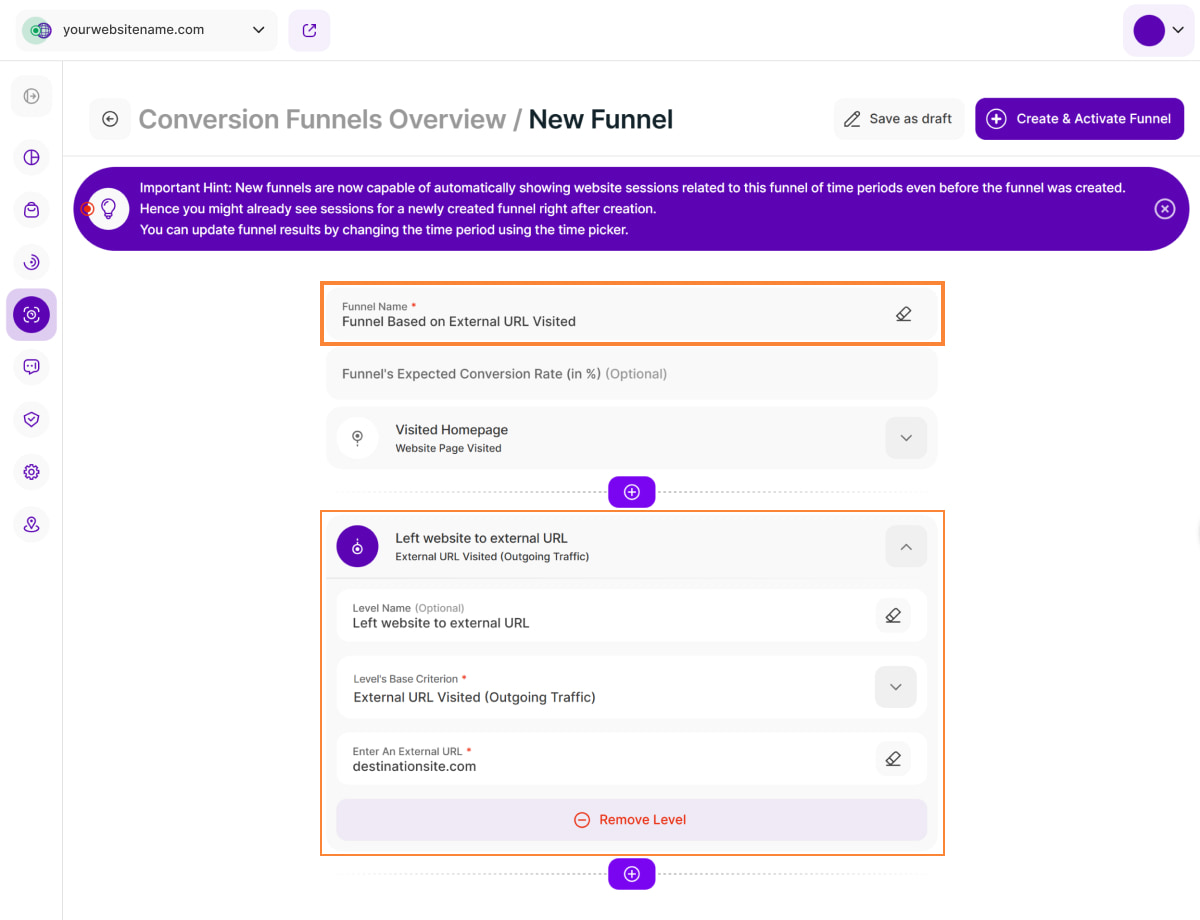 - For every created funnel, sessions will be counted as converted, even if visitors navigate to other pages on your site between funnel levels. The crucial factor is that a visitor must visit the funnel levels in the exact order during the session. As long as the funnel level order is respected, the session is counted as converted. Even so, if a visitor skips one of the steps, the conversion will not happen.
