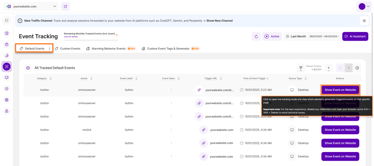 The Default Events tab provides a complete overview of every default event triggered by website visitors within the specific timeframe you selected. It is split into two insightful sections: