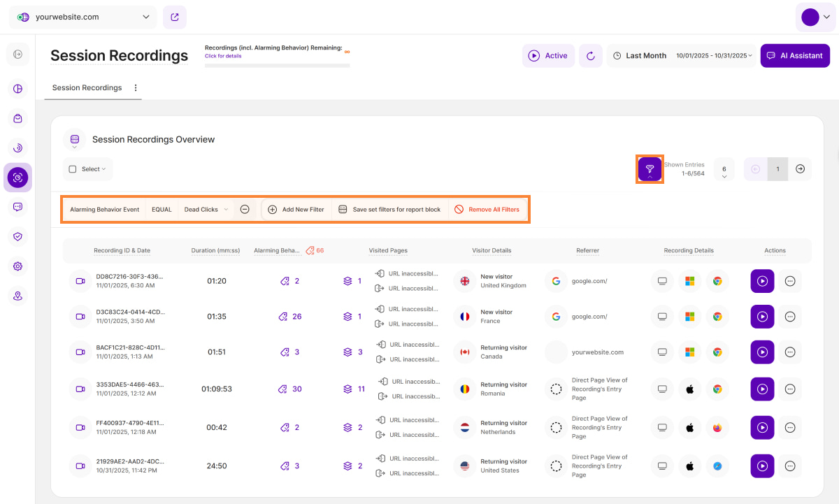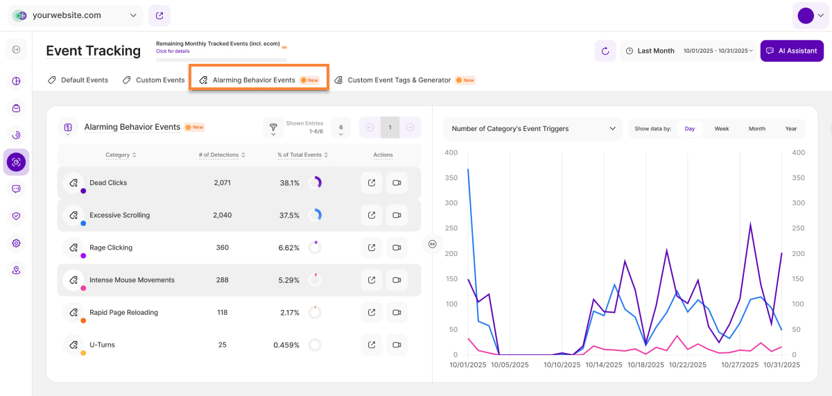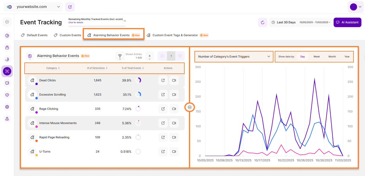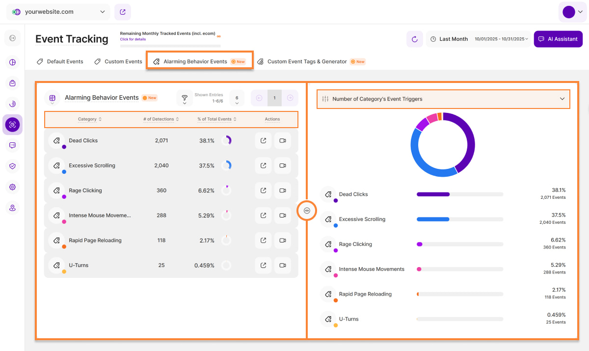 The tab also contains further details about such sessions (e.g., session recordings) that generate specific behavioral events. The table and visualizations show data on various alarming behavioral events that were recorded on the website. They help you identify potential interaction problems and improve the visitor experience.