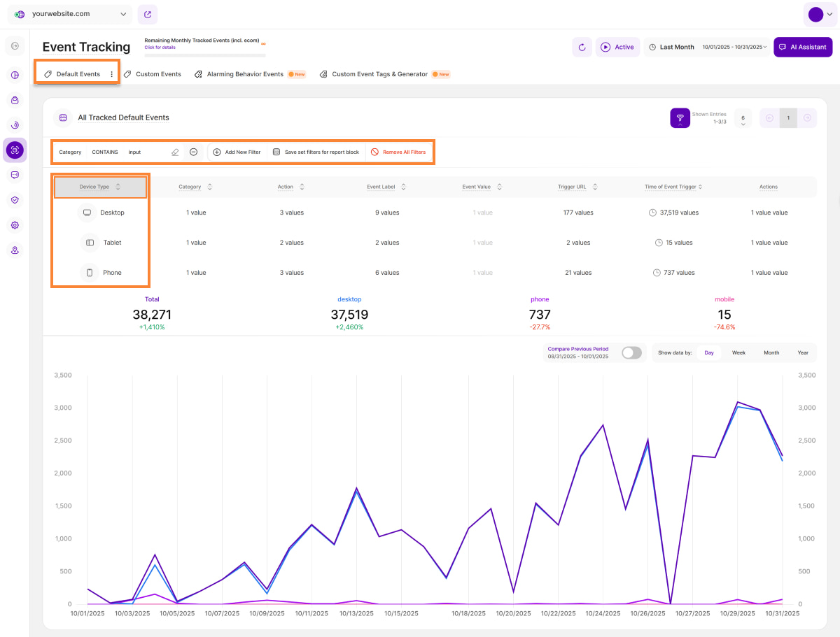 - Device Type: This column displays the device type that was used to trigger the event on your website.