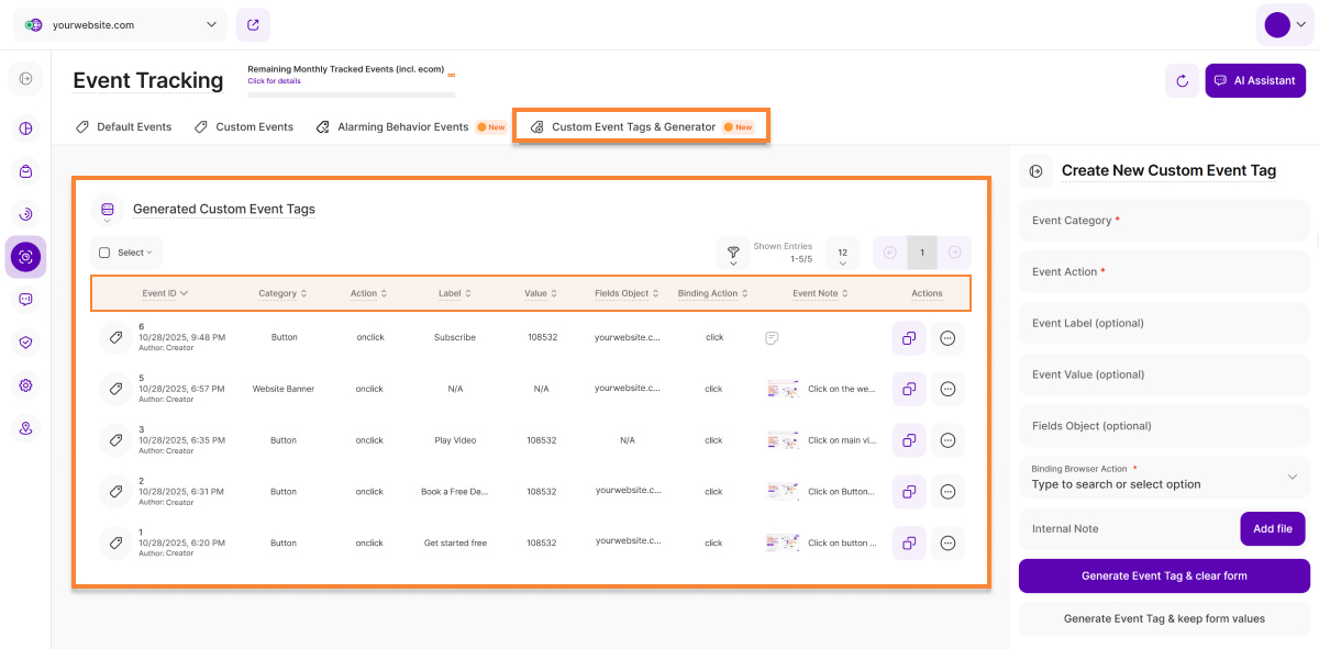 - Event Note: This column displays any notes that a contributor may have added to the custom event when creating it using the platform's custom event tag generator. This can help to better understand the context of a specific custom event (e.g., in teams).