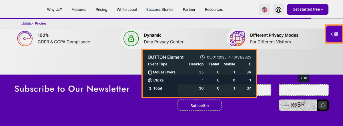 Hint: Our tracking may not currently capture data from invisible elements that appear only after a visitor interacts with the website. This includes elements like login text input fields, search fields revealed by clicking an icon, etc. These interactive elements may appear as "0" on the live preview because they aren't visible when the page first loads, but they are tracked correctly on the table. We're currently working on improvements to capture data from these dynamic elements in the future.
