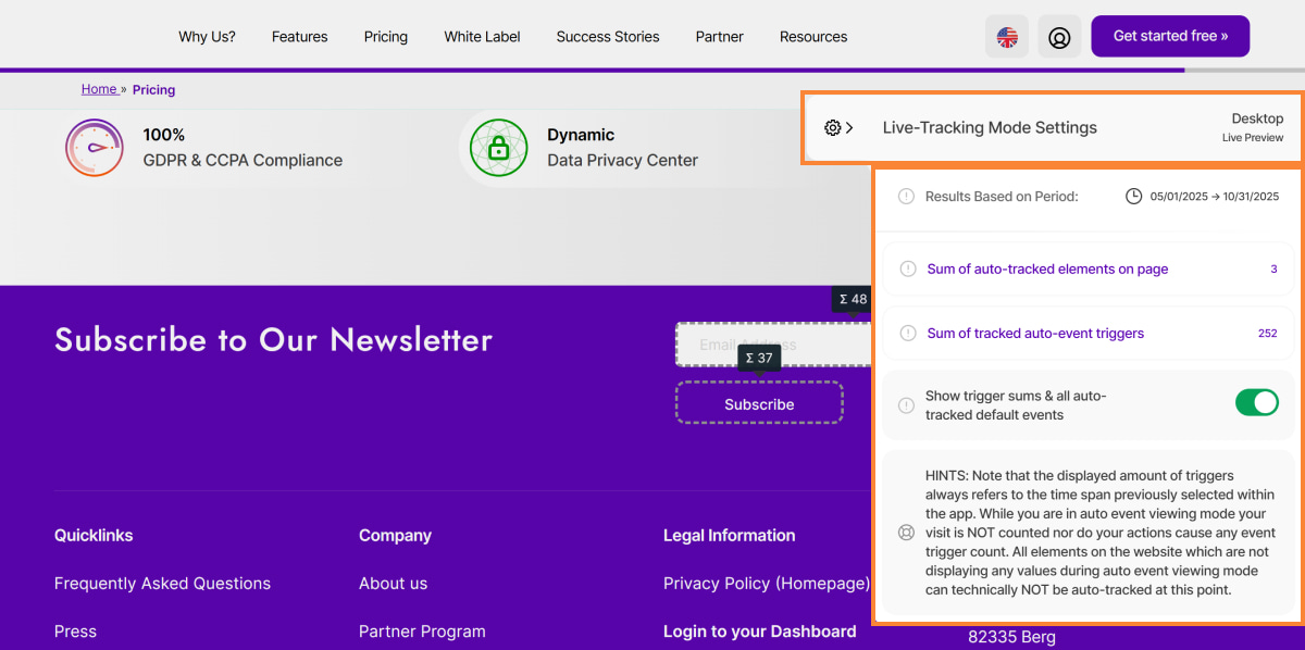 - Show trigger sums & all auto-tracked default events: Activating this option will highlight all default elements which could be auto-detected by our system(only visible for you in this live tracking mode). Furthermore you will see a sum of all event triggers for each highlighted element in the selected period of time. Clicking on these trigger sums will provide you with more details about how this sum is generated.