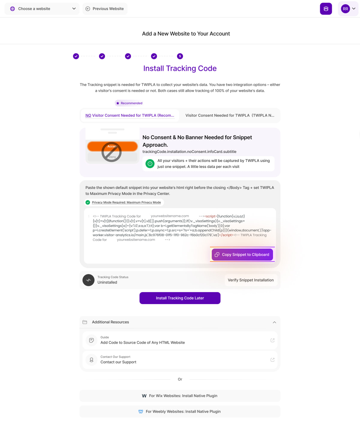 If you selected 'Install Tracking Code Later' during the onboarding process or require reinstallation, copy the code provided, paste it into your website's source code, and then click Verify Snippet Installation.